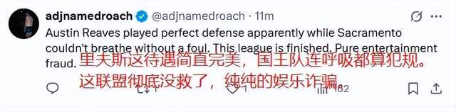 而在这当中,湖人里夫斯一人就获得了高达22次罚球,而他也是迎来了生涯之夜。全场22投11中,三分球9中5,22罚21中,爆砍生涯新高的51分,外加11篮板9助攻,打出了一场史诗级别的表现。可由于罚球数的关系,也遭到了很多质疑,美国网友就直言:“里夫斯这待遇完美,国王队连呼吸都算犯规,这联盟彻底没救了。”