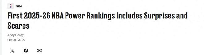 火箭队高居第3!在NBA开打一周之际,美媒《bleacherreport》也根据开季至今表现更新公布NBA最新实力榜,其中马刺队飙升第5,勇士队第7湖人队第8。